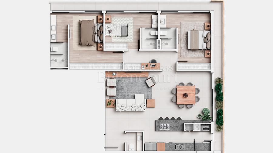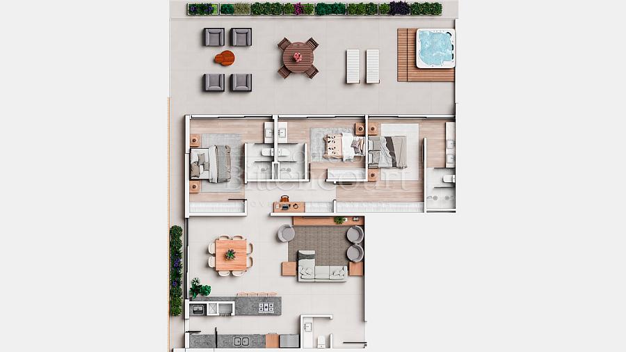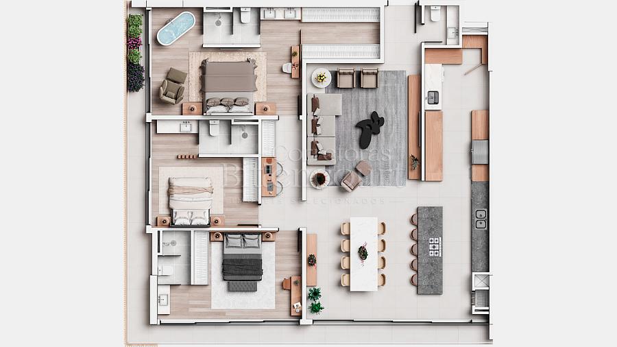 O empreendimento oferece apartamentos de 3 suítes, com metragens que variam de 168m² a 207m², além de giardinos de 227m², proporcionando ainda mais espaço.