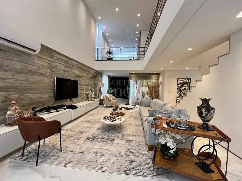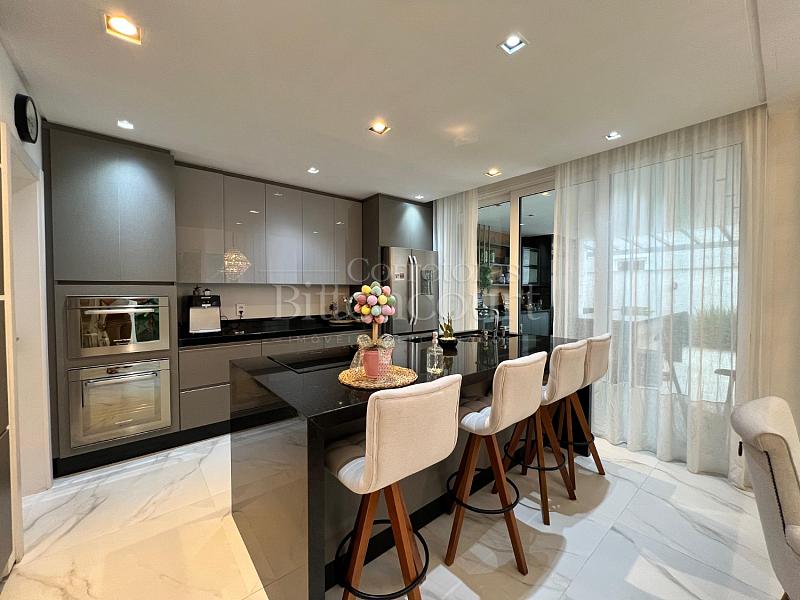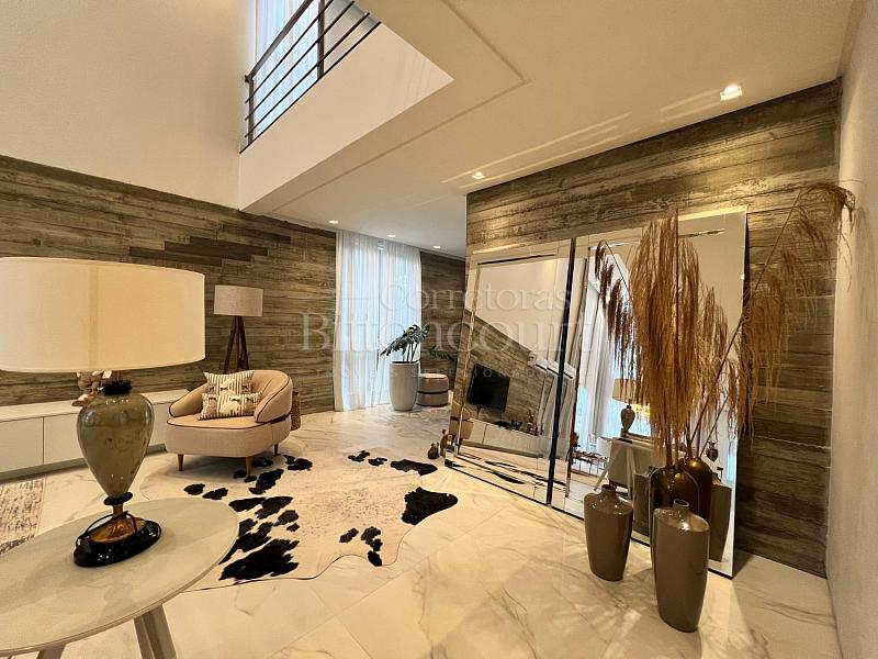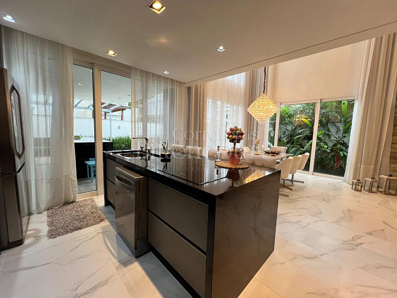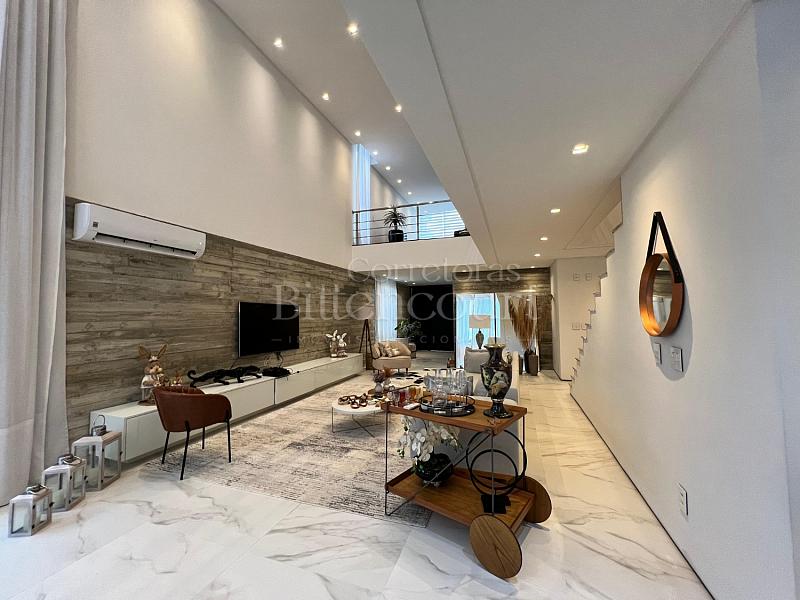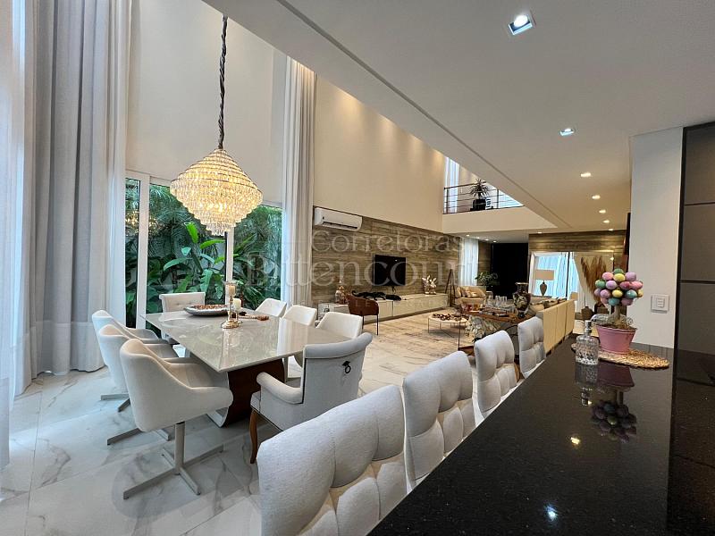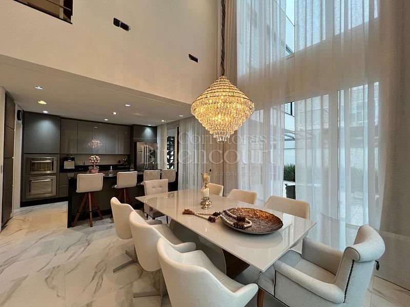 Essa casa tem muita luz natural, pé direito alto e um acabamento de alto padrão. Conta com ambientes amplos e integrados no primeiro piso, sendo uma sala de tv, de jantar e cozinha. Além de um escritório e toda a área gourmet com piscina.