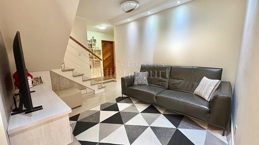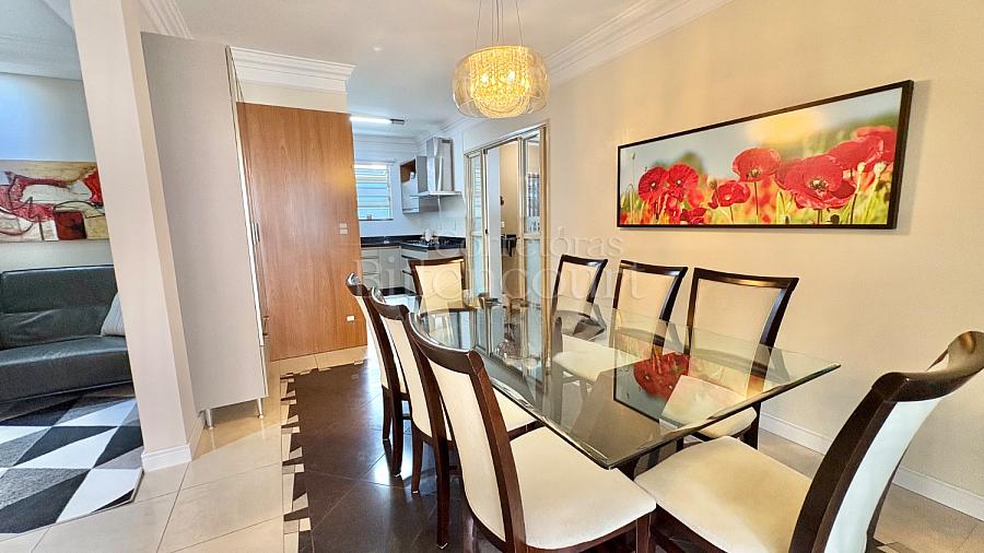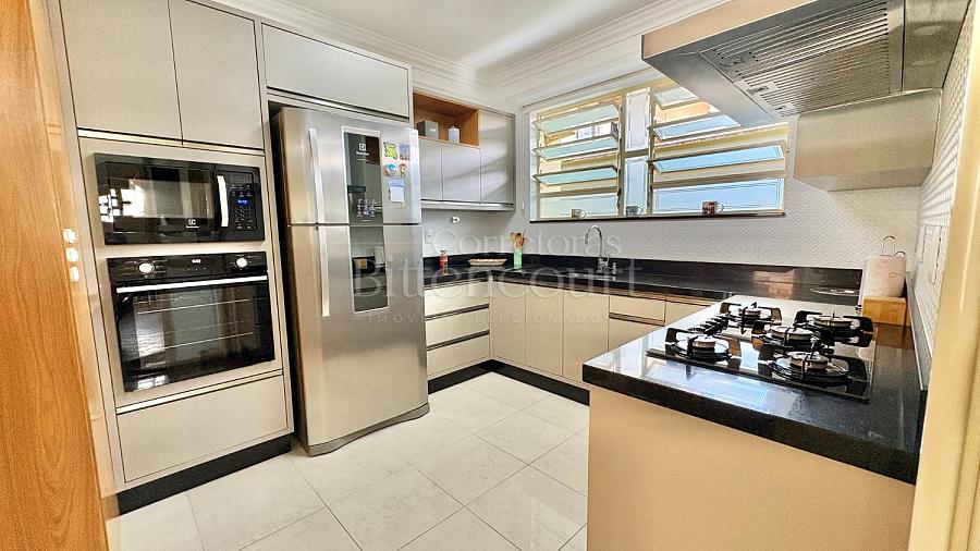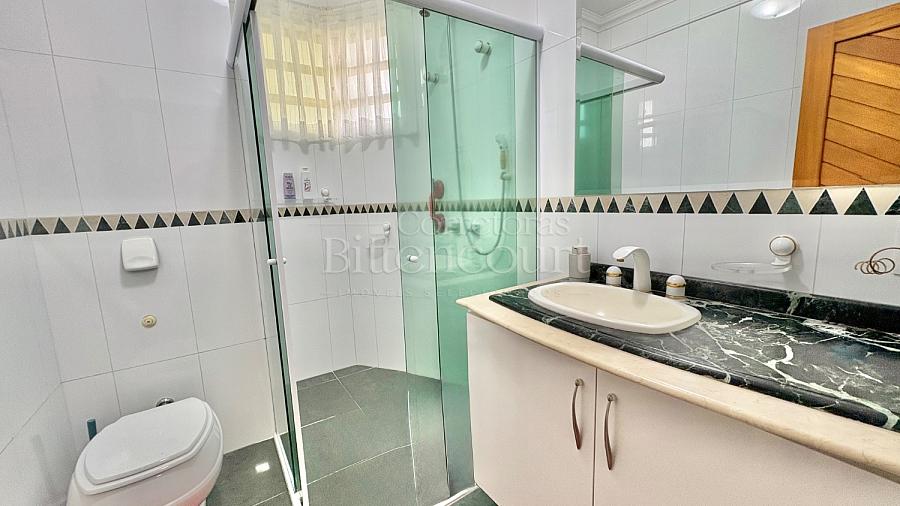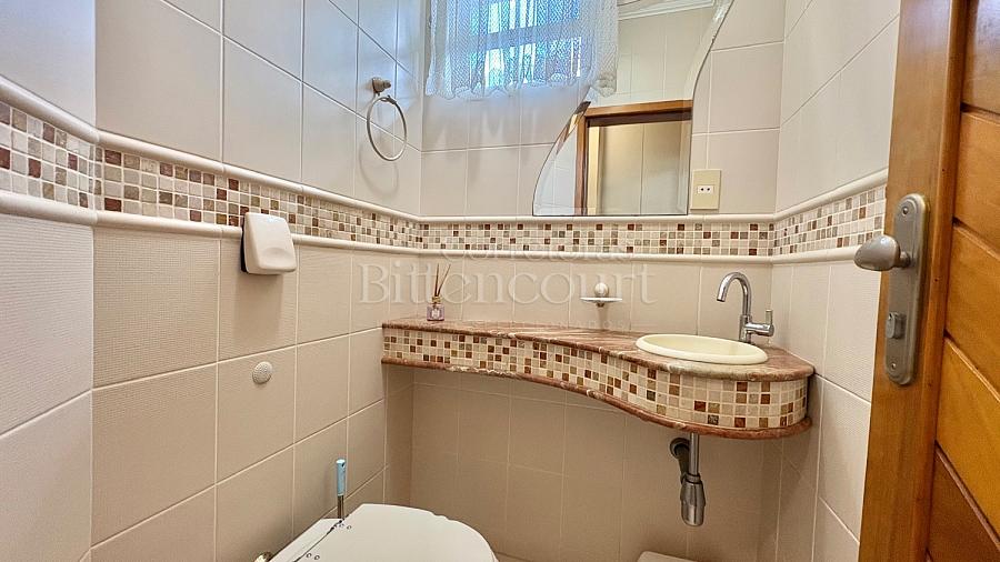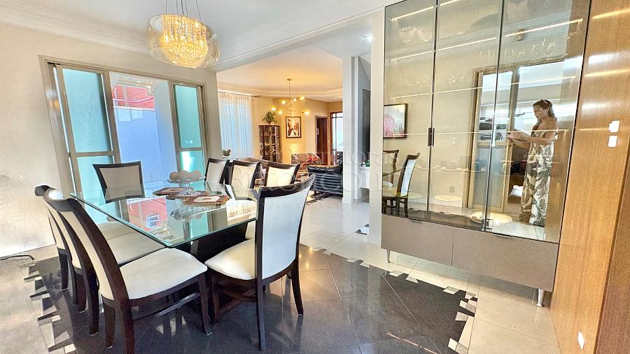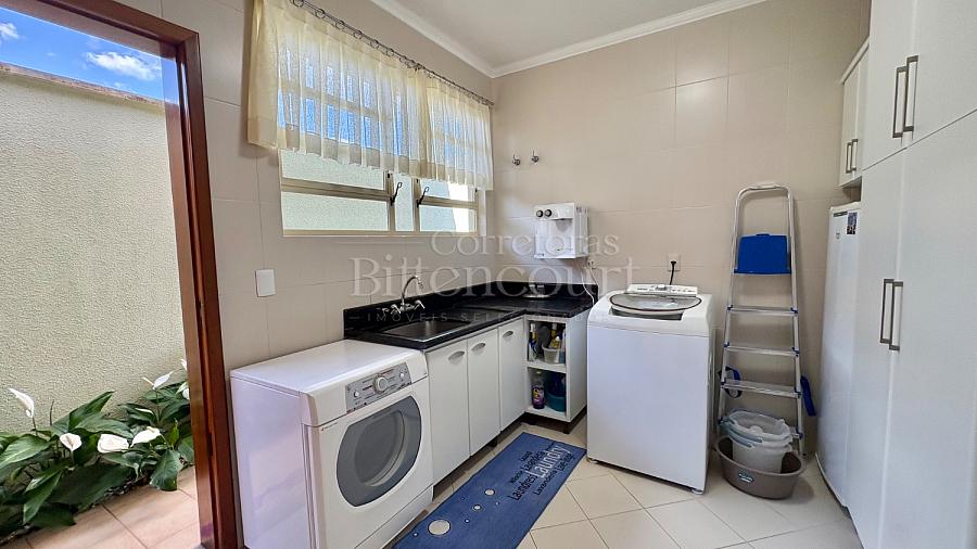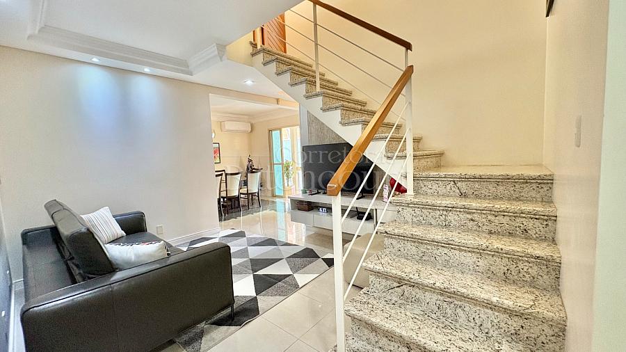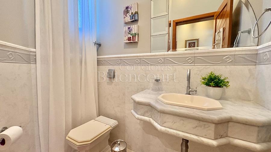 No piso inferior conta com sala de estar, jantar, sala de tv, cozinha, lavanderia, banheiro de serviço, lavabo, suíte principal com closet e banheira, banheiro social e 01 dormitório.