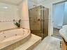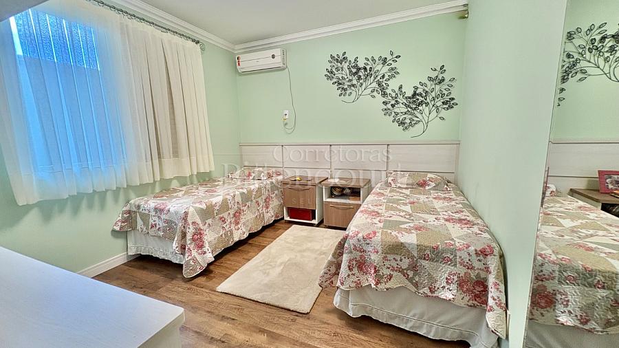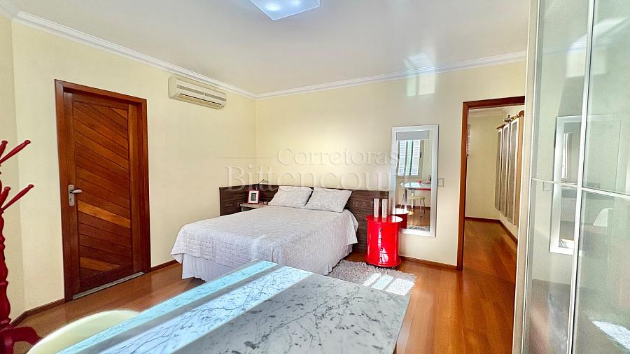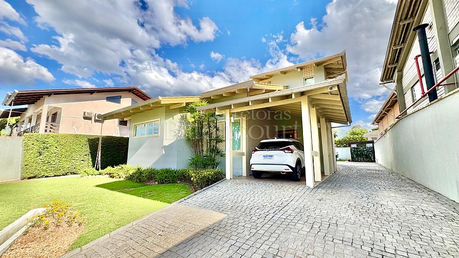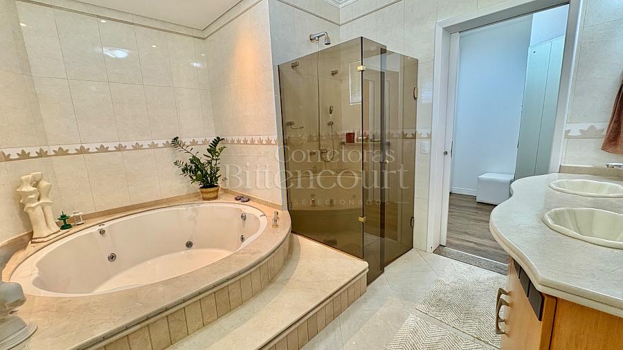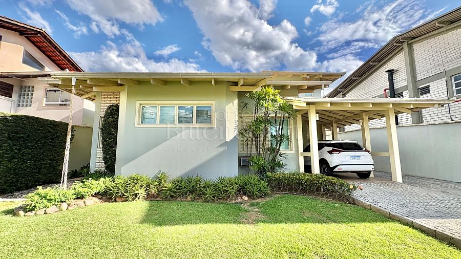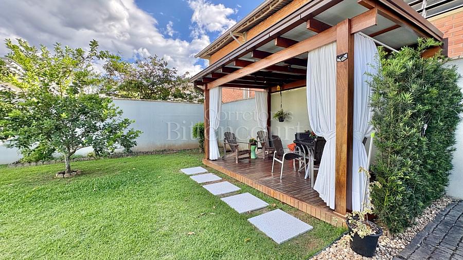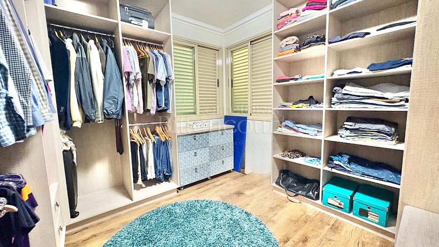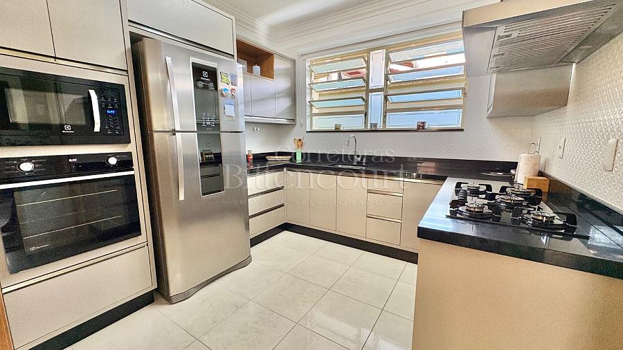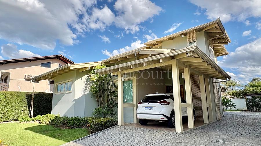 No piso inferior conta com sala de estar, jantar, sala de tv, cozinha, lavanderia, banheiro de serviço, lavabo, suíte principal com closet e banheira, banheiro social e 01 dormitório.
