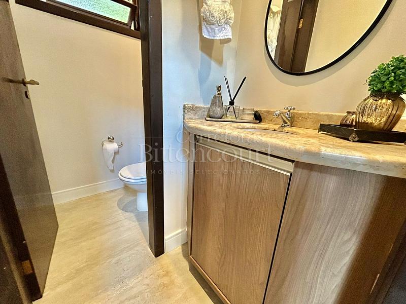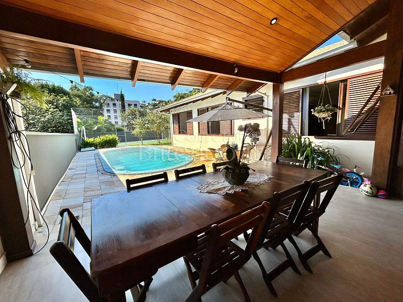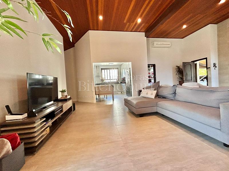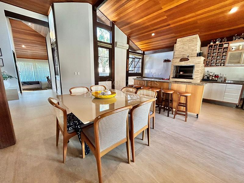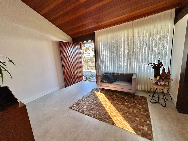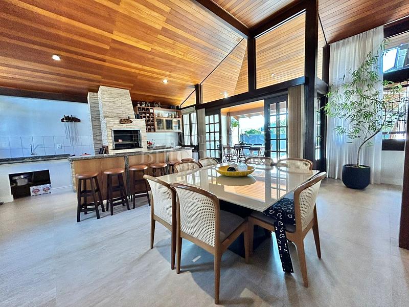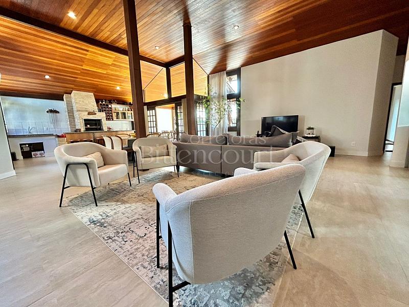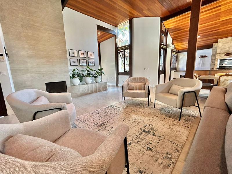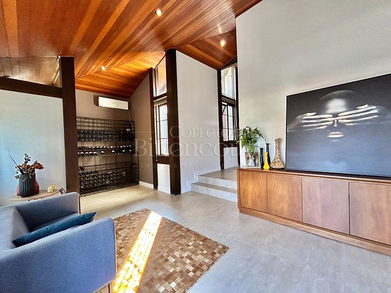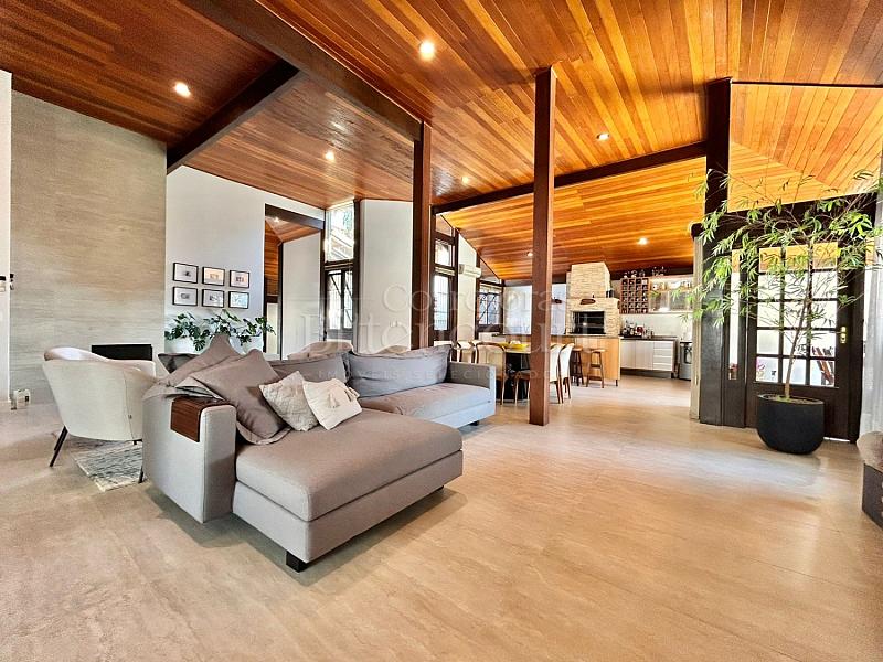 Entrando na casa pela porta de visitas você se depara com uma sala íntima e adega, e logo em seguida pode-se ver um living amplo com pé direito duplo com forro de madeira, super imponente e aconchegante ao mesmo tempo. Neste living, temos uma sala com lareira e também sala de tv. Integrados com sala de jantar e área gourmet.