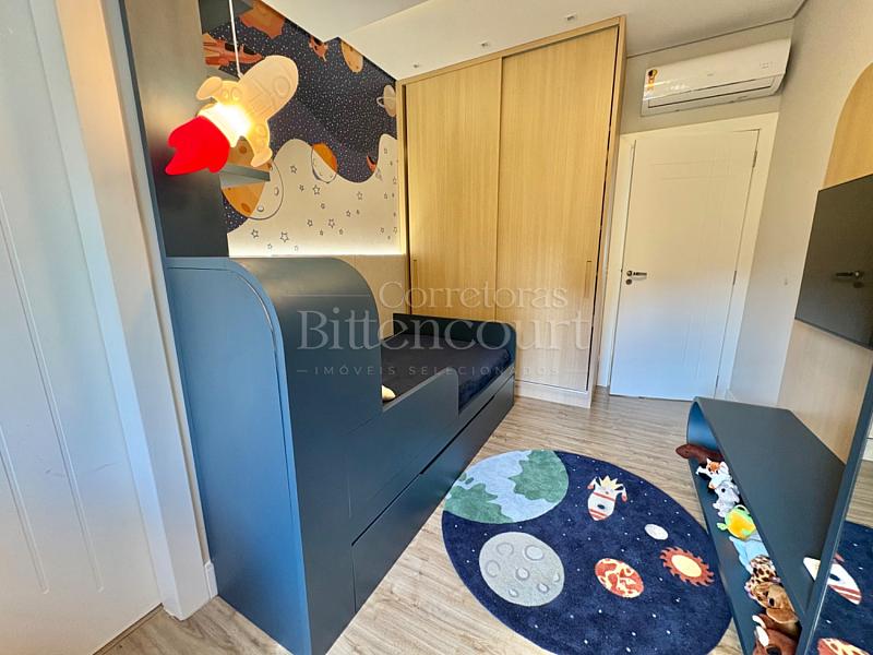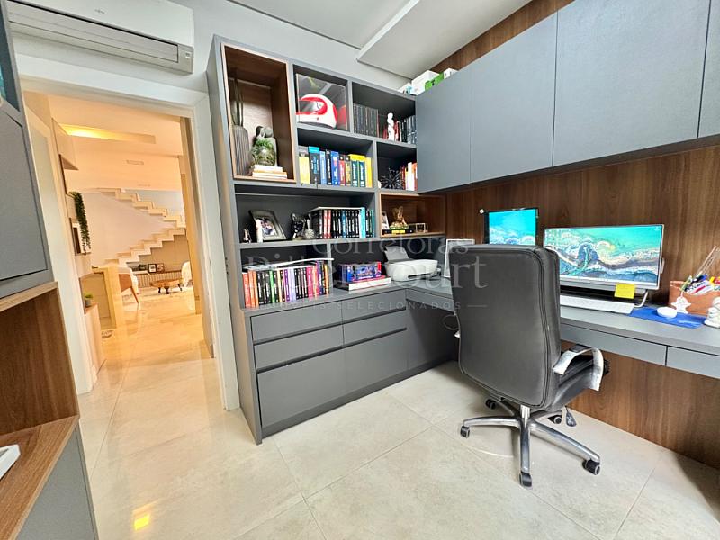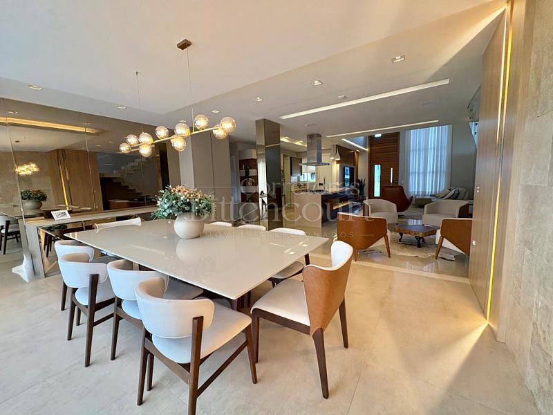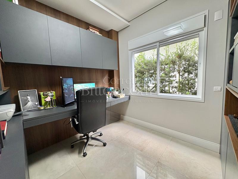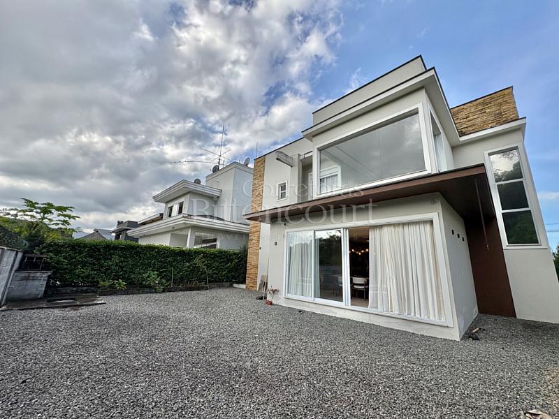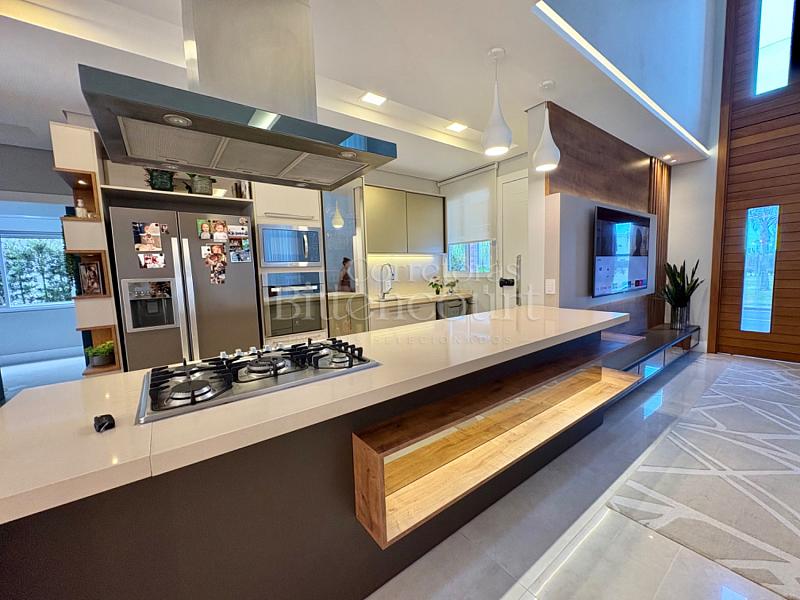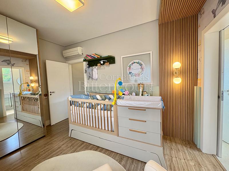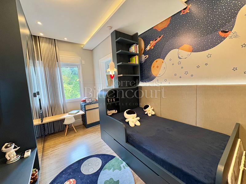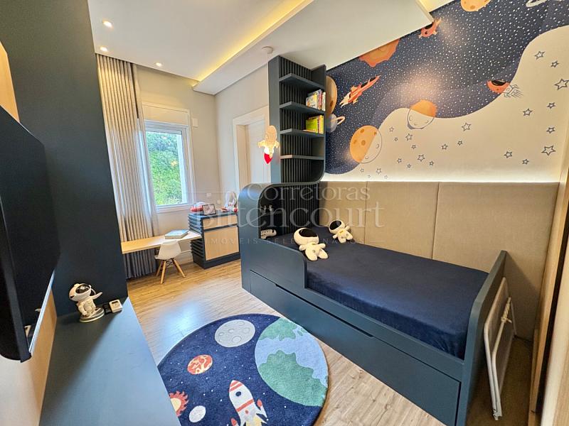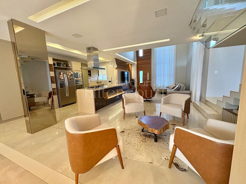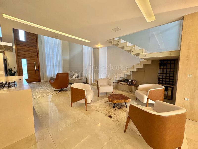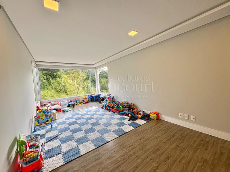 No piso superior são 3 suítes e um mezanino que está sendo utilizado como sala de brinquedos, porém pode ser personalizado para sala de tv ou escritório. Já no piso inferior amplo living, seno a sala com pé direito duplo, cozinha toda equipada, banheiro completo, lavanderia, escritório fechado e garagem para dois carros.