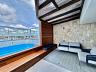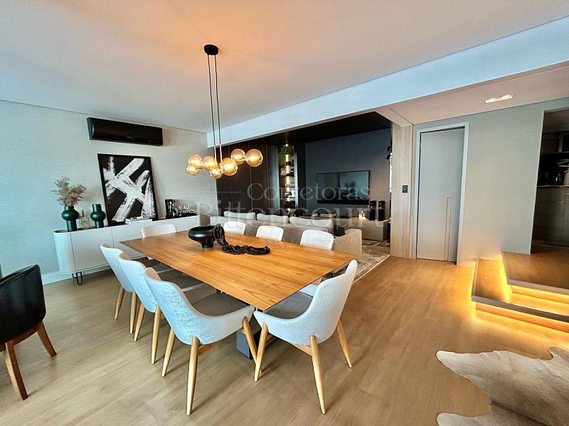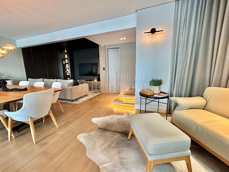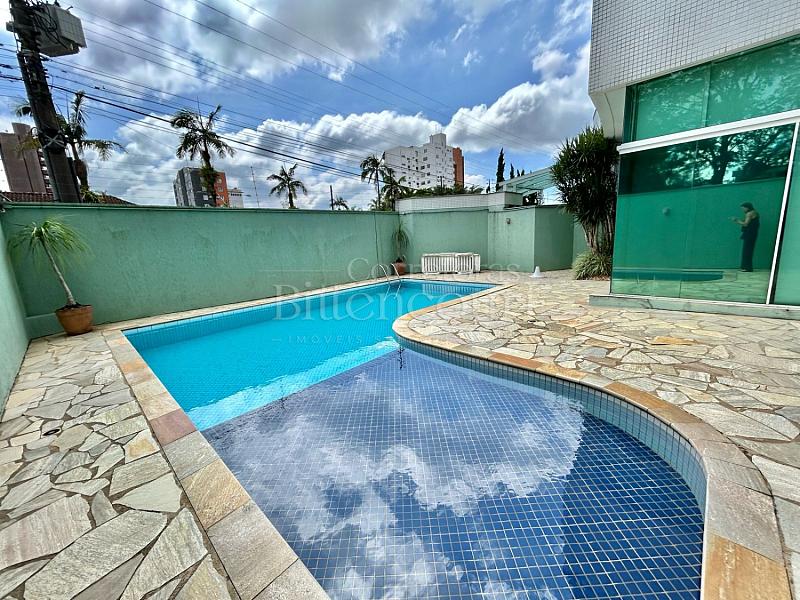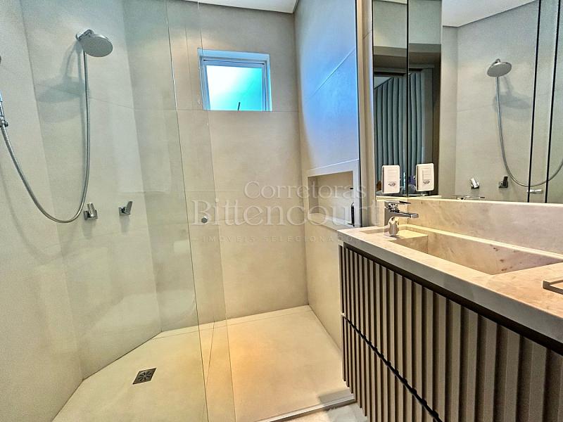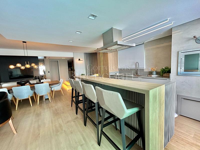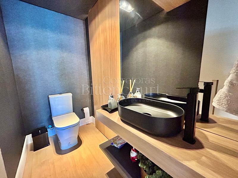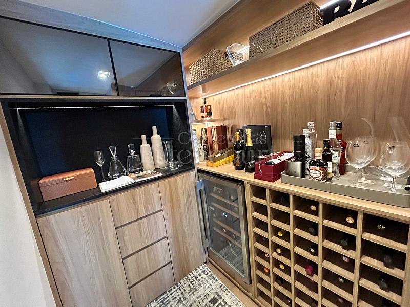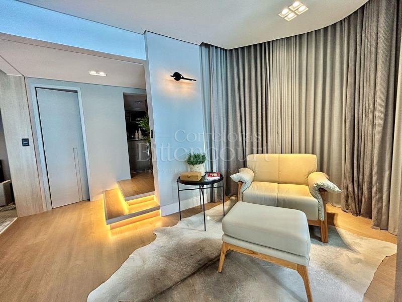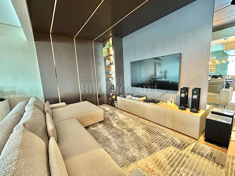 No piso superior, área social composta por sala de TV, espaço gourmet com churrasqueira, lavabo, adega e terraço com piscina privativa.