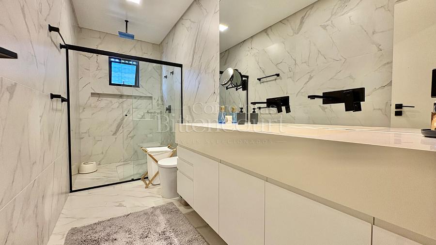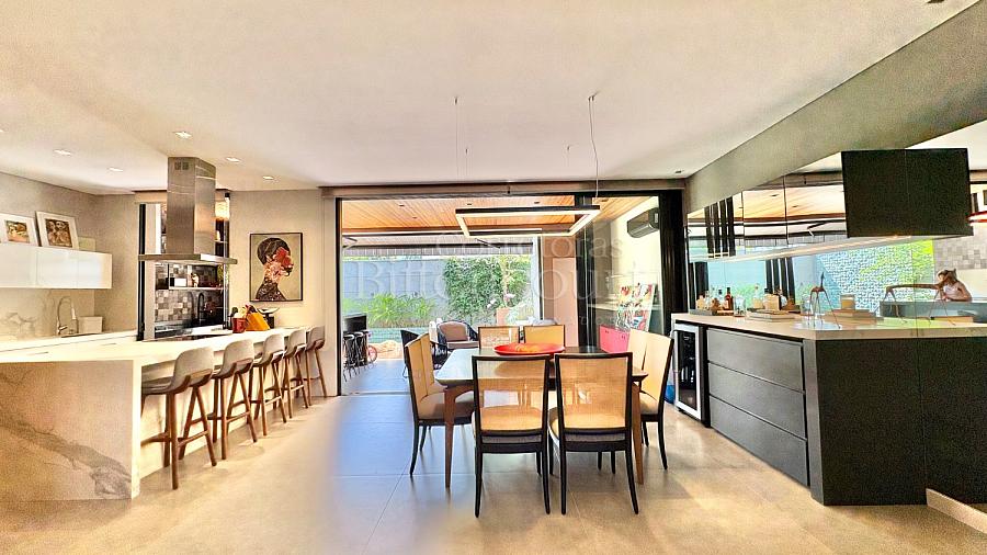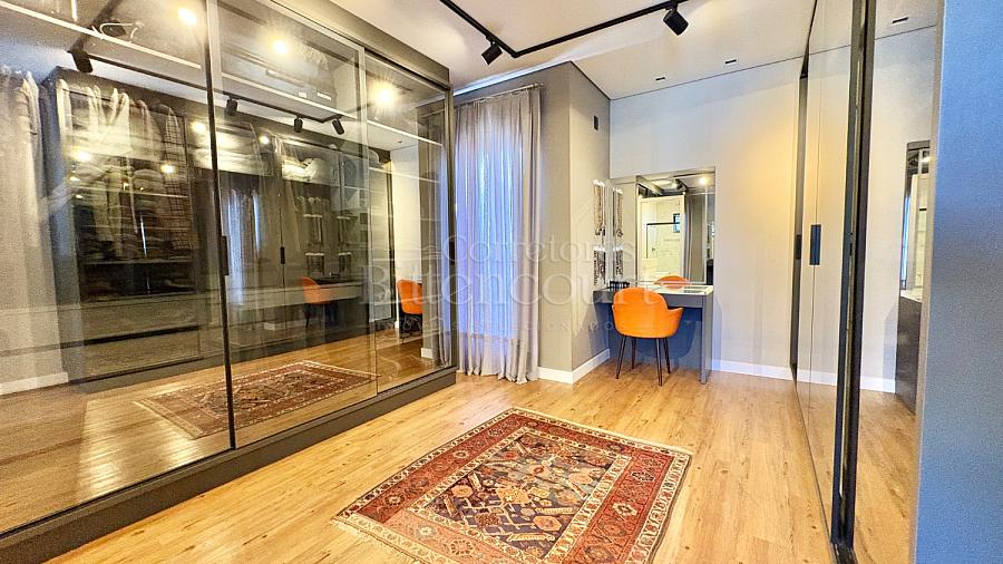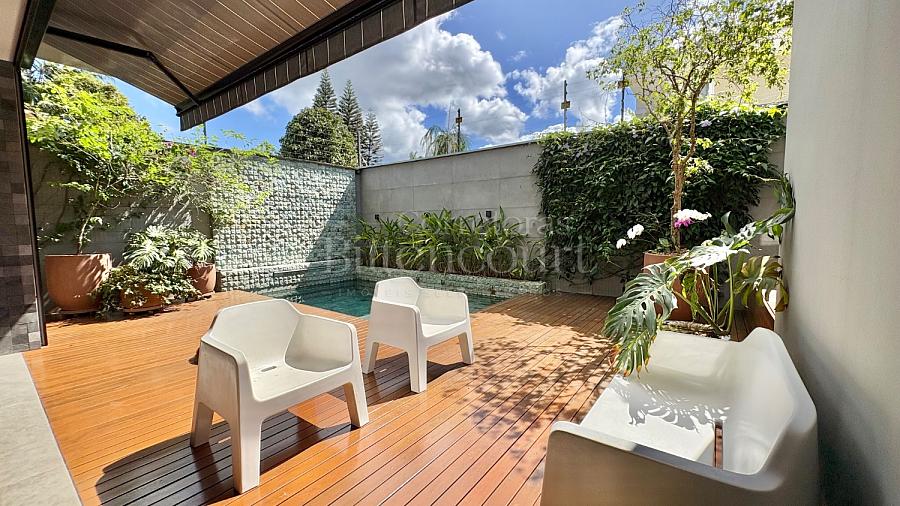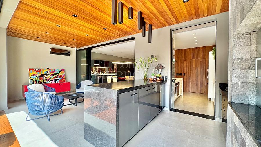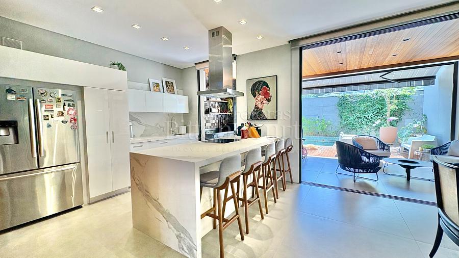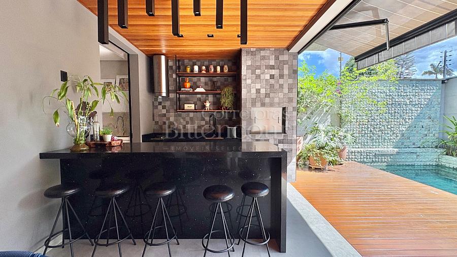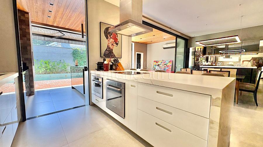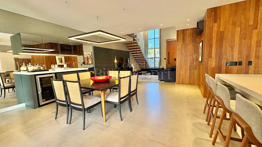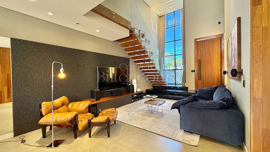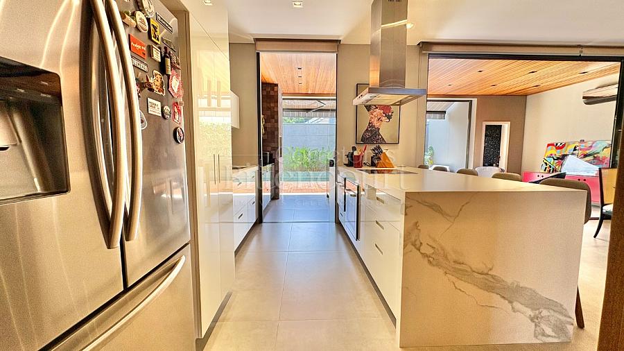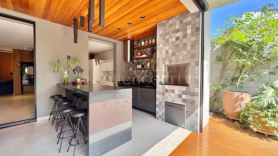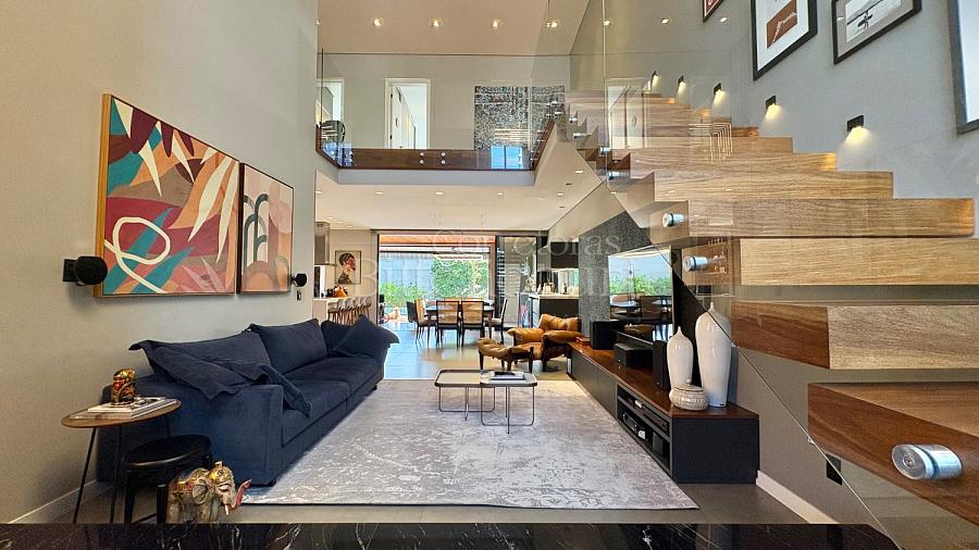 A configuração dele é excelente: sala com pé direito duplo, espaço de cozinha e gourmet que integram à piscina, lavanderia com acesso externo, suíte principal com closet e outras duas suítes com sacada.